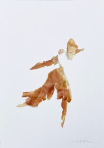Sarah Heckles creates small figurative works on paper using onion skins as her primary material. “This work expresses a universal theme of moving in our bodies, often joyfully,” says Heckles. Drawn to the material’s “familiar yet unexpected” qualities, Heckles uses its natural forms to evoke subtle human gestures. “I pay attention to our rhythms of walking, the weight of stepping, the stretch of reaching, and the shrugs of shoulders.” Her figures invite viewers to explore their own relationship to their bodies and to each other.