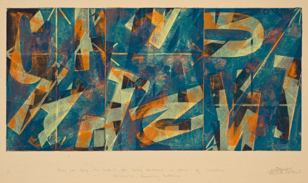 Palmarin Merges is a Filipina American artist whose work draws from the desire to become more sustainable by re-using materials close at hand and by adapting restriction as a generative force for creation. Trained as a Printmaker, she now works primarily in mixed media, especially household waste – plastic, cardboard, etc. These common materials taken from the fabric of her daily life are processed and then transformed into pattern, collage and concrete poetry.